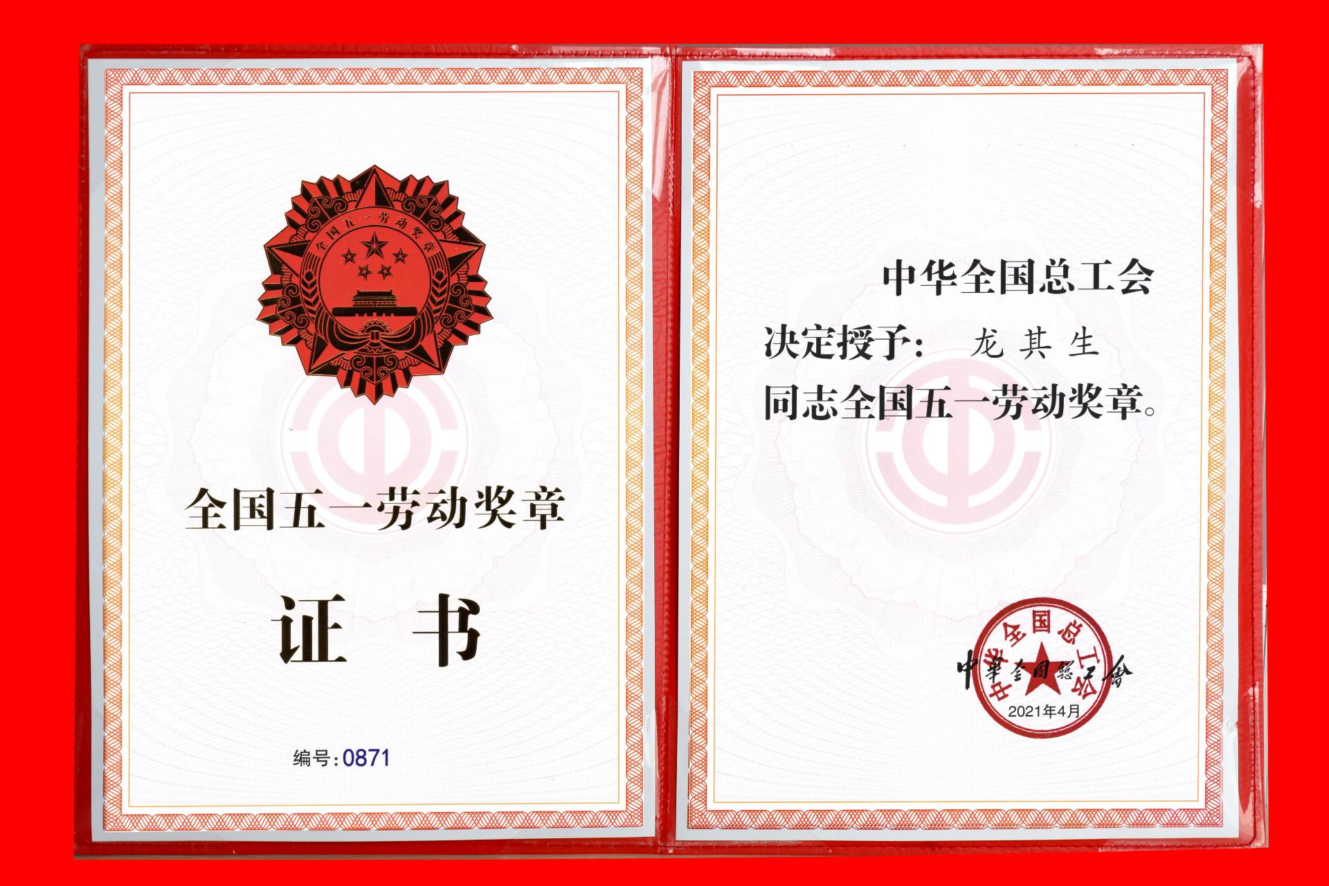 龍其生董事長(zhǎng)榮獲2021年全國(guó)五一勞動(dòng)獎(jiǎng)證書